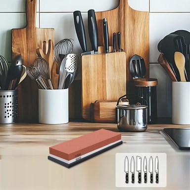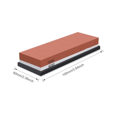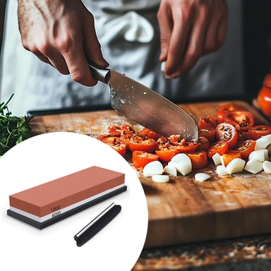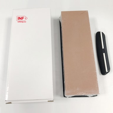 Komplett slipesett med brynestein, holder og slipestøtte. Brynesteinen har to sider med forskjellige kornstørrelser, en for å gjøre knivbladet flatere, den andre for å gjøre kantene skarpere. Silikonholderen holder bladet fast under knivsliping.