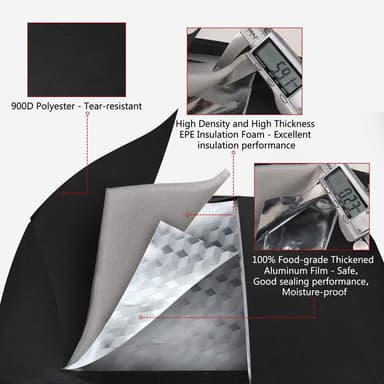 Effektiv isolasjon: Laget av høykvalitets Oxford-duk og foret med aluminiumsfolie, vår isolasjonspose holder effektivt på varmen, og holder måltidene dine varme og deilige til det er tid for å spise.