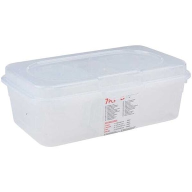 Spesifikasjon - Antall: 7-pakning - Størrelse: 28,5 x 17 x 9,5 cm - Materiale: Gjennomsiktig plast - Egenskaper: Stables med tettsittende lokk