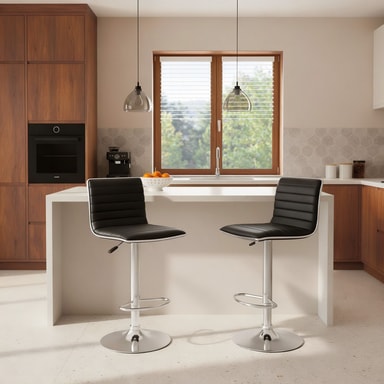 Tectake barkrakken tilbyr garantert god sittekomfort. Ikke bare visuelt forbedrer denne designerbarkrakken fra tectake hjemmet ditt, men den gir også komfortabel sittestilling når du spiser eller bare slapper av. Barkrakken er 360° dreibar og sømløst høydejusterbar. Gulvringen på barkrakkens base er laget av plast som er skånsom mot gulvet, og sørger for at de ikke sklir. Basen og rammen til barkrakken er laget av forkrommet stål og sørger for mer stabilitet. Det imiterte skinntrekket til barkrakkene er enkelt å rengjøre og vedlikeholde. Disse barkrakkene vil garantert etterlate inntrykk hos gjestene dine, enten de er på kjøkkenet, baren eller i stuen.