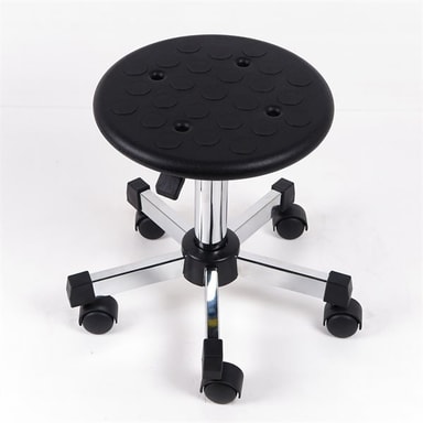 Spesifikasjon - Overflatemateriale: PU polyuretanskum - Setepute: diameter 330mm - Chassis: høydejustering opp og ned - Stolbein: kaldvalset stål med krombelegg, hjul uten sveiseteknologi, diameter 550 mm - Hjul: PA nylonrulle - Justerbar høyde: 420~560mm