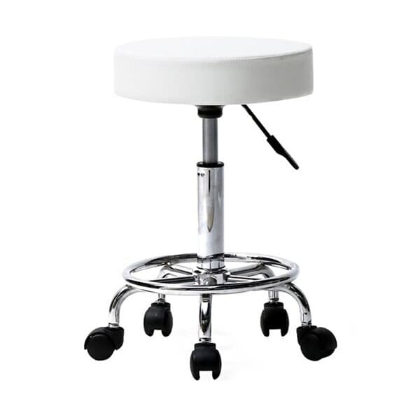 Hvit moderne frisørstol på hjul. Det som gjør frisørstolen til en ergonomisk stol er at den er rulle- samt høy- og senkbar via en hydraulisk stang under setet, noe som gjør det lett å forandre stilling og sted. Høyden kan justeres fra 45 cm til 57 cm. Stolsetets diameter er 33 cm. Fotstøtten gir behagelig støtte for trøtte ben og føtter.