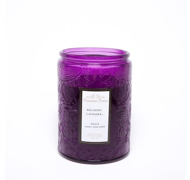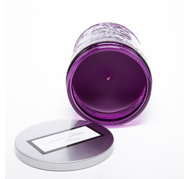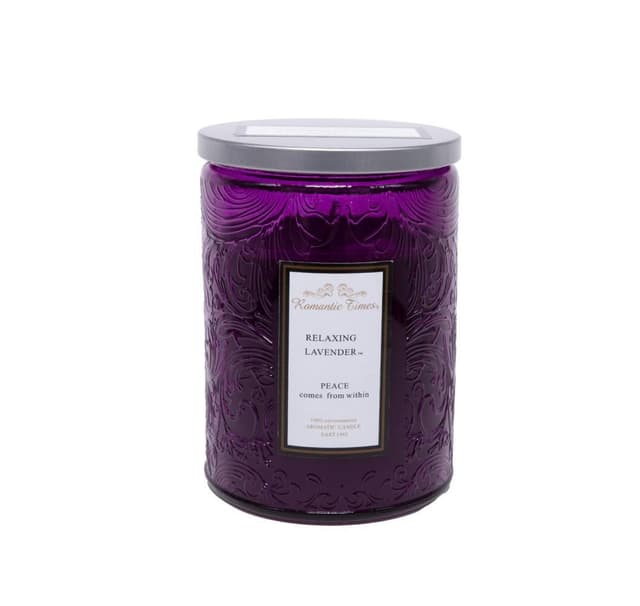 Glasskrukkelys ROMANTIC TIMES, D8xH11cm, med lokk, lilla (duft- LAVENDEL). Brennetid ca 50 timer. Klarfarget glasskrukke med lokk, fargematchende voks i flekkete finish med duft 2%.