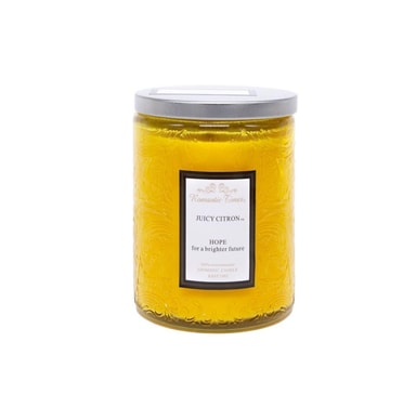 Glasskrukkelys ROMANTIC TIMES, D7xH9cm, med lokk, gult, (duft- JUICY CITRON). Brennetid ca 32 timer. Klarfarget glasskrukke med lokk, fargematchende voks i flekkete finish med duft 2%.