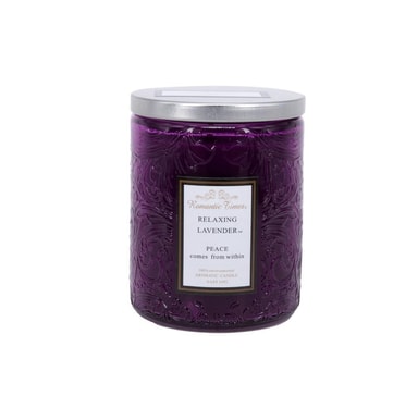 Glasskrukkelys ROMANTIC TIMES, D7xH9cm, med lokk, lilla (duft- LAVENDEL). Brennetid ca 32 timer. Klarfarget glasskrukke med lokk, fargematchende voks i flekkete finish med duft 2%.