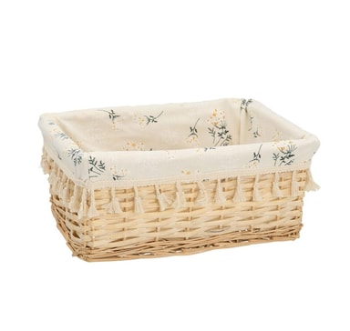 Kurvmateriale: håndvevd naturlig pilefleting. Tekstilfôr: bomullsstoff med blomstermotiv.