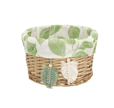Kurvmateriale: håndvevd naturlig pilefleting. Tekstilfôr: bomullsstoff med mønster av grønne blader.