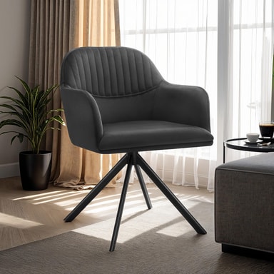 Møbelet imponerer med sitt svært fine fløyelstrekk, som ikke bare er et visuelt høydepunkt, men som i kombinasjon med den store seteskålen og de gjennomgående arm- og ryggstøttene med høy tetthet polstring gir en supermyk og behagelig sitteopplevelse. En spesiell funksjon ved denne universelt anvendelige stolen er dens lettgående, 360° dreiefunksjon, som gjør at du trinnløst kan endre posisjon når som helst.