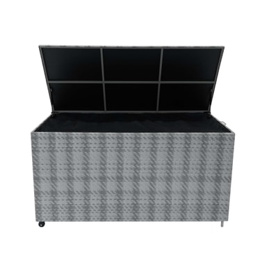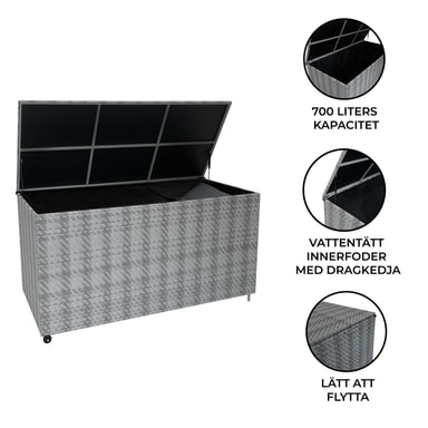 Hold uterommet ditt uanstrengt ryddig med denne førsteklasses 700L rottingoppbevaringsboksen, designet for både praktisk og stil. Denne oppbevaringsboksen er bygget med holdbarhet i tankene, og har maskinvevd polyrattan, og tilbyr en elegant finish av høy kvalitet som motstår slitasje over tid. Den solide stålrammen sikrer langvarig støtte, noe som gjør den til et pålitelig valg for hager, terrasser eller til og med innendørs. Et UV-bestandig ytre forbedrer ikke bare dens moderne estetikk, men sikrer også langvarig holdbarhet. Med en sjenerøs kapasitet på 700 liter, fungerer denne gjennomtenkte kisten som det ideelle akkompagnementet til våre Jardi Marielle rottingmøbelsett, og gir komfortabelt hus for alle putene. Alternativt kan den brukes som frittstående oppbevaring for hageverktøy og utendørs nødvendigheter. Dette sikrer beskyttelsen deres under de kaldere, våtere månedene, samt holder plassen din fri for rot. Denne oppbevaringsboksen er designet for både brukervennlighet og stabilitet, og inneholder gjennomtenkte detaljer som forbedrer funksjonaliteten. De hydrauliske stiverne sørger for jevn, kontrollert lokkåpning, mens stålhåndtaket og de integrerte hjulene gjør omposisjonering uanstrengt. På motsatt side gir solide føtter en sikker base som holder boksen godt på plass når den står stille. Enten du trenger å flytte den for enkelhets skyld eller holde den fast på ett sted, gir denne velbalanserte designen fleksibilitet. En fremtredende funksjon er det innebygde vanntette fôret, som sitter pent inne i esken for å beskytte innholdet mot regn og fuktighet. Når den er helt glidelås over toppen, skaper den en fullstendig forsegling, og holder alt inne tørt og beskyttet under alle værforhold. Det UV-bestandige, grå polyrattan eksteriøret forbedrer ikke bare sin moderne estetikk, men sikrer også langvarig holdbarhet, og forhindrer falming og skade fra soleksponering. Med sin blanding av stil, holdbarhet og bekvemmelighet er denne 700L Marielle rottingoppbevaringsboksen et must-have for ethvert utendørs eller innendørs rom. Enten du organiserer terrassen din, rydder opp i hagen din eller forbedrer utendørsinnredningen, tilbyr denne oppbevaringsløsningen både eleganse og praktisk. Produktegenskaper: * Fantastisk maskinvevd grå rotting * Sjenerøs 700L lagringskapasitet * Innebygd vanntett fôr for beskyttelse * Enkel portabilitet med 2 hjul og håndtak * Gassassistert lokkløftemekanisme Spesifikasjoner: * Farge: Grå * Vekt: 21,9 kg * Eskemateriale: Polyrattan * * Rammemateriale: 80 cm 0,8m / 31,5"" * Bredde: 150cm / 1,5m / 59,1"" * Dybde: 72cm / 0,72m / 28,3"" * Kapasitet: 700L * UV-bestandig: Ja Innhold i eske: * 1 x sikker oppbevaringsboks