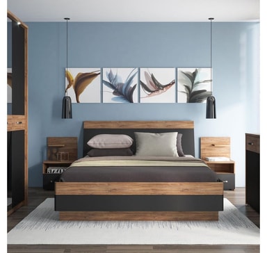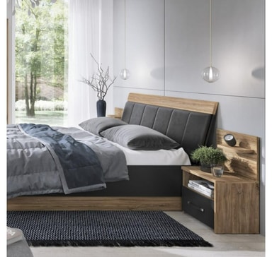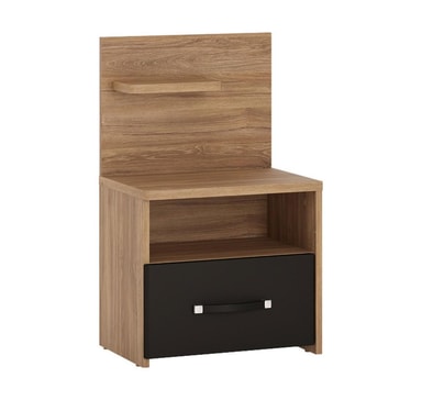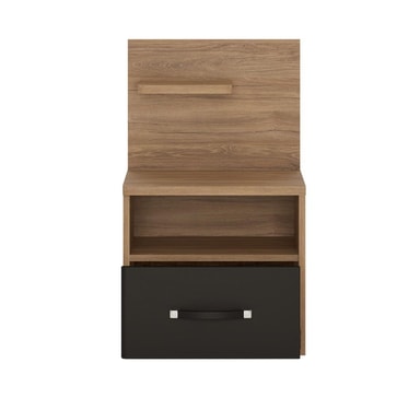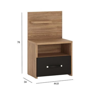 Nattbord MONACO venstre. Monaco-kolleksjonen tilbyr et luksuriøst og rikt soveromsdesign. Det moderne, elegante nattbordet sammen med de andre enhetene i Monaco-serien vil gjøre din oase original. Eikedekoren sammen med den mørke frontdelen gir stykket liv. Skuffen har metallhåndtak og soft-close-system, som gjør bruken av skapet praktisk og lydløs. Nattbordet er laget av laminert sponplate. Frontdelen er laget av MDF. Dimensjonene på produktet er 44,8x34xH76cm. Produktet er laget i EU.