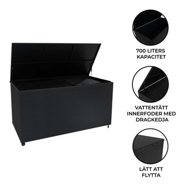 Hold uterommet ditt uanstrengt ryddig med denne førsteklasses 700L rottingoppbevaringsboksen, designet for både praktisk og stil. Denne oppbevaringsboksen er bygget med holdbarhet i tankene, og har maskinvevd polyrattan, og tilbyr en elegant finish av høy kvalitet som motstår slitasje over tid. Den solide stålrammen sikrer langvarig støtte, noe som gjør den til et pålitelig valg for hager, terrasser eller til og med innendørs. Et UV-bestandig ytre forbedrer ikke bare dens moderne estetikk, men sikrer også langvarig holdbarhet. Med en sjenerøs kapasitet på 700 liter, fungerer denne gjennomtenkte kisten som det ideelle akkompagnementet til våre Jardi Serafina rottingmøbelsett, og gir komfortabelt hus for alle putene. Alternativt kan den brukes som frittstående oppbevaring for hageverktøy og utendørs nødvendigheter. Dette sikrer beskyttelsen deres under de kaldere, våtere månedene, samt holder plassen din fri for rot. Denne oppbevaringsboksen er designet for både brukervennlighet og stabilitet, og inneholder gjennomtenkte detaljer som forbedrer funksjonaliteten. De hydrauliske stiverne sørger for jevn, kontrollert lokkåpning, mens stålhåndtaket og de integrerte hjulene gjør omposisjonering uanstrengt. På motsatt side gir solide føtter en sikker base som holder boksen godt på plass når den står stille. Enten du trenger å flytte den for enkelhets skyld eller holde den fast på ett sted, gir denne velbalanserte designen fleksibilitet. En fremtredende funksjon er det innebygde vanntette fôret, som sitter pent inne i esken for å beskytte innholdet mot regn og fuktighet. Når den er helt glidelås over toppen, skaper den en fullstendig forsegling, og holder alt inne tørt og beskyttet under alle værforhold. Det UV-bestandige utsiden av svart polyrattan forbedrer ikke bare sin moderne estetikk, men sikrer også langvarig holdbarhet, og forhindrer falming og skade fra soleksponering. Med sin blanding av stil, holdbarhet og bekvemmelighet, er denne 700L Serafina rottingoppbevaringsboksen et must for ethvert utendørs eller innendørs rom. Enten du organiserer terrassen din, rydder opp i hagen din eller forbedrer utendørsinnredningen, tilbyr denne oppbevaringsløsningen både eleganse og praktisk. Produktegenskaper: * Forbløffende maskinvevd svart rotting * Sjenerøs 700L lagringskapasitet * Innebygd vanntett fôr for beskyttelse * Enkel portabilitet med 2 hjul og håndtak * Gassassistert lokkløftemekanisme Spesifikasjoner: * Farge: Svart * Vekt: 21,9 kg * Eskemateriale: Polyrattan * Rammemateriale: 80m / 0cm * Rammemateriale: Stål. 31,5"" * Bredde: 150cm / 1,5m / 59,1"" * Dybde: 72cm / 0,72m / 28,3"" * Kapasitet: 700L * UV-bestandig: Ja Innhold i eske: * 1 x sikker oppbevaringsboks