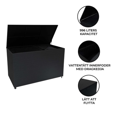 Hold uteplassen uanstrengt ryddig med denne førsteklasses 996L rottingoppbevaringsboksen, designet for både praktisk og stil. Denne oppbevaringsboksen er bygget med holdbarhet i tankene, og har maskinvevd polyrattan, og tilbyr en elegant finish av høy kvalitet som motstår slitasje over tid. Den solide stålrammen sikrer langvarig støtte, noe som gjør den til et pålitelig valg for hager, terrasser eller til og med innendørs. Et UV-bestandig ytre forbedrer ikke bare dens moderne estetikk, men sikrer også langvarig holdbarhet. Med en generøs kapasitet på 996L, fungerer denne gjennomtenkte kisten som det ideelle akkompagnementet til våre Jardi Serafina rottingmøbelsett, og gir komfortabelt hus for alle putene. Alternativt kan den brukes som frittstående oppbevaring for hageverktøy og utendørs nødvendigheter. Dette sikrer beskyttelsen deres under de kaldere, våtere månedene, samt holder plassen din fri for rot. Denne oppbevaringsboksen er designet for både brukervennlighet og stabilitet, og inneholder gjennomtenkte detaljer som forbedrer funksjonaliteten. De hydrauliske stiverne sørger for jevn, kontrollert lokkåpning, mens stålhåndtaket og de integrerte hjulene gjør omposisjonering uanstrengt. På motsatt side gir solide føtter en sikker base som holder boksen godt på plass når den står stille. Enten du trenger å flytte den for enkelhets skyld eller holde den fast på ett sted, gir denne velbalanserte designen fleksibilitet. En fremtredende funksjon er det innebygde vanntette fôret, som sitter pent inne i esken for å beskytte innholdet mot regn og fuktighet. Når den er helt glidelås over toppen, skaper den en fullstendig forsegling, og holder alt inne tørt og beskyttet under alle værforhold. Det UV-bestandige utsiden av svart polyrattan forbedrer ikke bare sin moderne estetikk, men sikrer også langvarig holdbarhet, og forhindrer falming og skade fra soleksponering. Med sin blanding av stil, holdbarhet og bekvemmelighet, er denne 996L Serafina rottingoppbevaringsboksen et must for ethvert utendørs eller innendørs rom. Enten du organiserer terrassen din, rydder opp i hagen din eller forbedrer utendørsinnredningen, tilbyr denne oppbevaringsløsningen både eleganse og praktisk. Produktegenskaper: * Fantastisk maskinvevd sort rotting * Sjenerøs 996L lagringskapasitet * Innebygd vanntett fôr for beskyttelse * Enkel portabilitet med 2 hjul og håndtak * Gassassistert lokkløftemekanisme Spesifikasjoner: * Farge: Svart * Vekt: 25,9 kg * Eskemateriale: Polyrattan * Rammemateriale: 98 cm / 0 cm * Rammemateriale: Stål. / 38,6"" * Bredde: 155cm / 1,55m / 61"" * Dybde: 80cm / 0,8m / 31,5"" * Kapasitet: 996L * UV-bestandig: Ja Innhold i eske: * 1 x sikker oppbevaringsboks