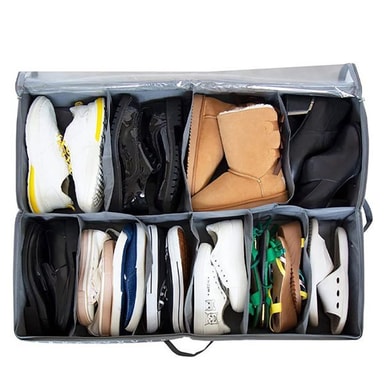 Spesifikasjon - Farge: svart - Kapasitet: 1 pakke, rommer opptil 12 par sko - Materiale: Slitesterkt tekstil med beskyttende lokk