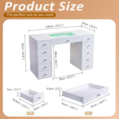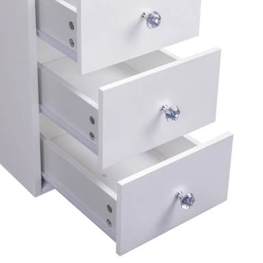 Dette sminkebordet har 11 romslige skuffer, som gir god oppbevaringsplass for kosmetikk, hudpleieprodukter, smykker og mer. Skuffene glir jevnt og lydløst, og gir en sømløs og diskret brukeropplevelse