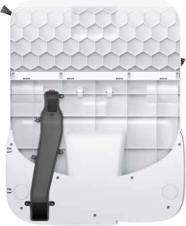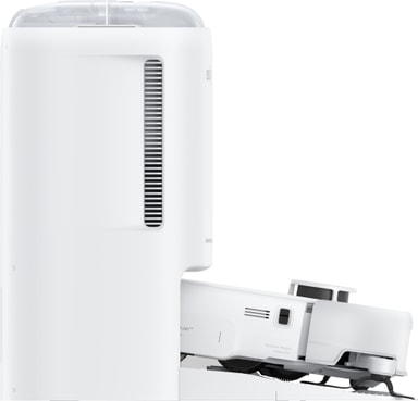 Basestasjonen tar seg av det meste av vedlikeholdet: den tømmer støvbeholderen, vasker og tørker moppen med varmluft, fyller på rent vann og doserer til og med vaskemiddel – for en nærmest helt vedlikeholdsfri opplevelse.