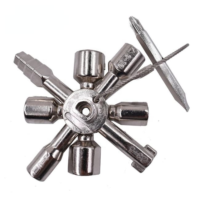 Universell nøkkel for bruk i tekniske installasjoner, heiser, el-skap, gass- og vannforsyning og ulike avstengningssystemer. Kompakt og lett, lett å bære.