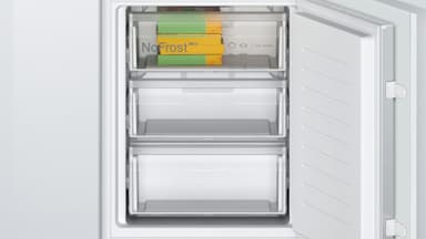 Bosch KIN86NSE0 Kjøleskap/fryser: elegant innebygd design med NoFrost-teknologi, LED-belysning og stillegående 35dB drift for et moderne kjøkken.Les mer om produktet