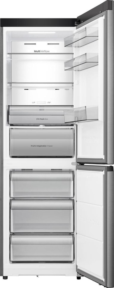 Denne modellen er utstyrt med et avansert bunnkjølesystem som sikrer jevn luftstrøm fra den nedre delen av kjøleskapet og oppover, noe som gir jevne, stabile temperaturer på alle hyller. Dette beskytter matvarekvaliteten og reduserer temperatursvingninger, slik at matvarene holder seg friske lenger. Det gir også et romsligere interiør, med færre hindringer og mer brukbart volum.