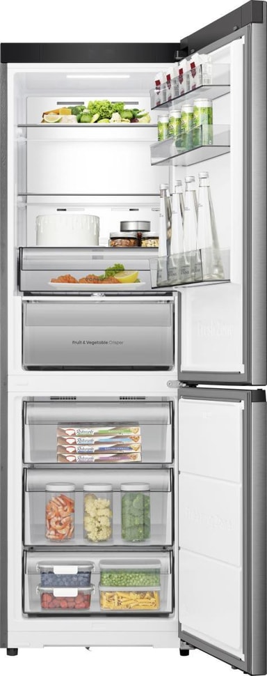 Selv om RB3K330SEIE er kompakt i størrelse (595 mm bred, 600 mm dyp), har den hele 330 liter oppbevaringsplass: 215 l i kjøleskapet og 115 l i fryseren. Innredningen er designet for fleksibilitet, med justerbare hyller og dedikerte soner for å holde alt på plass og lett å finne.