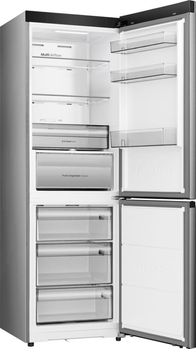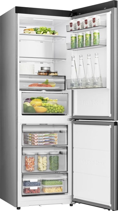 Hisense RB3K330SEIE frittstående kjøle-/fryseskap i inox er designet for å kombinere moderne design, praktisk matoppbevaring og langvarig friskhet. Med en flat passform, smart interiør og førsteklasses kjøling er det laget for kjøkken der plass og ytelse er avgjørende.