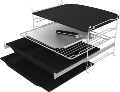 For enkelhet og sikkerhet er de pyrolysesikre teleskopskinnene designet for å bli værende i ovnen under pyrolyse. Med teleskopfunksjon blir håndtering av bakeplater tryggere og enklere. Platene kan enkelt tas ut for optimal oversikt over matlagingsprosessen.