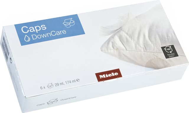 Miele DownCare vaskemiddel er utviklet for å gi dedikert og riktig behandling til dunprodukter. Vaskemiddelet sørger for at fjær ikke klumper seg, og lanolinet i kapslene sørger for effektiv og skånsom vask samtidig som elastisiteten og pusteevnen ivaretas. Kapslene kan brukes i alle Miele W1-vaskemaskiner.