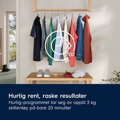 Hurtigprogrammet lar deg hurtigvaske klærne dine for lett rengjøring. Ta hånd om 3 kg klesvask på bare 20 minutter.