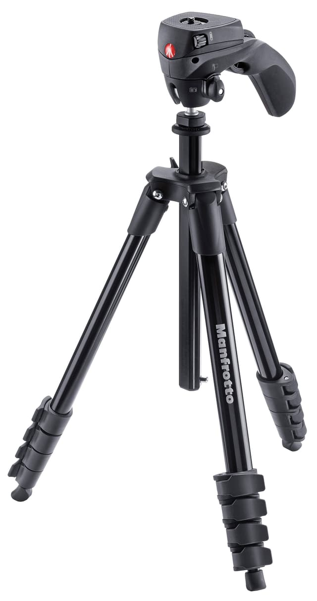 Manfrotto Compact Action tripod kommer med sammenleggbare ben som kan justeres i ulike høyder. Stativet kommer med et joystick-hode for enkel styring og bytte mellom actionkamera og fotomodus. Stativet bruker standard 1/4" kamerafeste.