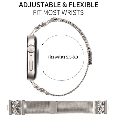 Sikker og komfortabel passform: Den justerbare magnetlåsen sikrer en sikker og personlig passform for alle håndleddsstørrelser. Det glatte nettingmønsteret i rustfritt stål føles behagelig mot huden, selv ved lengre tids bruk.