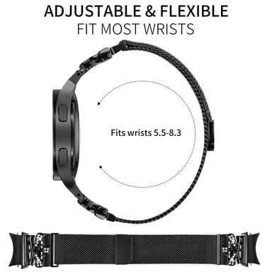 Elegant og stilig: Løft din Galaxy Watch med dette elegante og stilige armbåndet i rustfritt stål. Den svarte finishen gir håndleddet ditt et sofistikert preg, noe som gjør det til det perfekte tilbehøret til både hverdagslige og formelle anledninger.