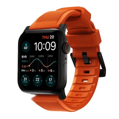 Designed to give your Apple Watch a modern, rugged look for daily wear or on your next adventure. Rugged Band is constructed from FKM, a soft yet strong fluoroelastomer that combines all-day comfort with lasting durability. Custom-designed, injection-molded stainless steel hardware provides a secure fit and unique style.