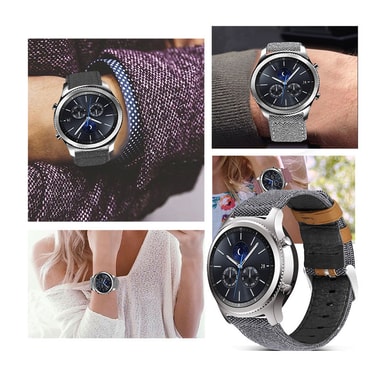 Dette båndet er designet for å passe Samsung smartklokker med en 22 mm knastbredde, og passer for ulike modeller. Laget av ekte skinn av høy kvalitet og utsmykket med en lerretstekstur, gir dette smartklokkebåndet en luksuriøs følelse og en stilig estetikk.