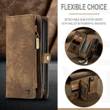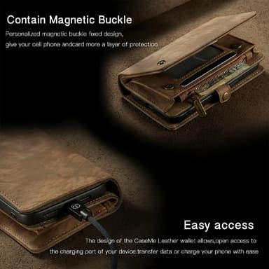 for kontanter. Laget i retrostil delt skinn + plastmateriale, høy kvalitet og slitesterk. Avtakbar 2-i-1 design, lær og innvendig skinnbelagt hardt skall. Magnetlås og snapfeste for sikker oppbevaring av kort og kontanter. Beskytt telefonen mot daglig skade og bær eiendelene dine med stil.