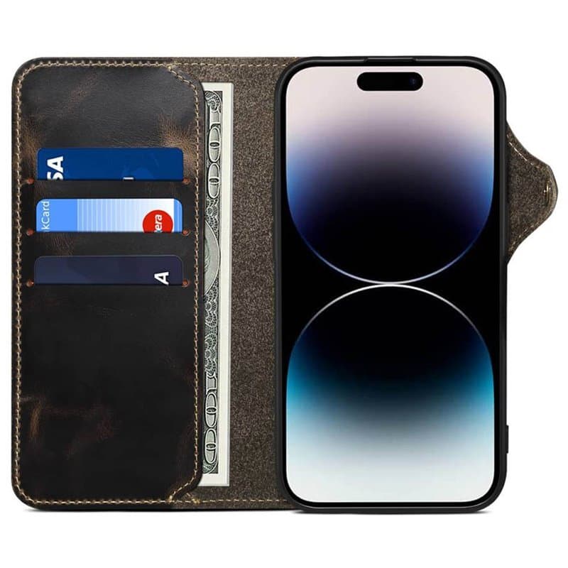 En eksklusiv og praktisk mobillommebok av ekte lær. Mobildekselet beskytter effektivt mobiltelefonen mot skitt, riper og støt. Utstyrt med kort lommer for f.eks. bankkort, ID-kort, førerkort, sedler, kvitteringer osv. Lommeboken er konstruert med tilgang til volumknapper, høyttaler, mikrofon, kamera og ladekontakt osv. Telefonen holdes på plass av en tilpasset ramme av slitesterk silikon/tpu. En magnetisk knappelås holder mobil lommeboken lukket.