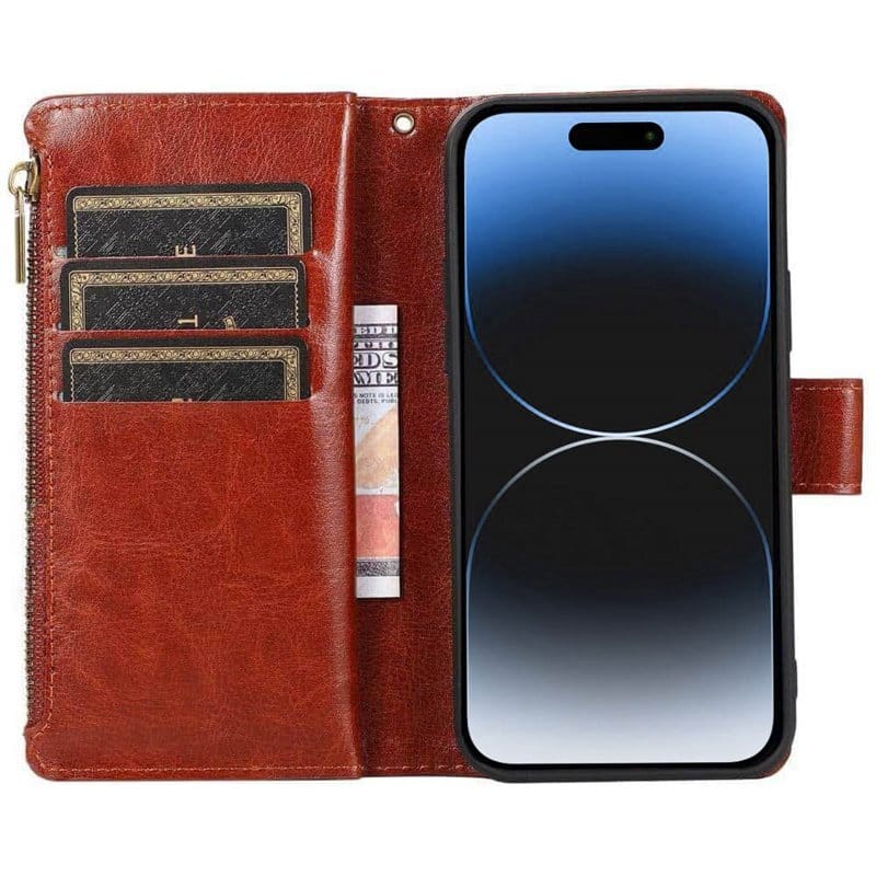 Mobil lommebok Dobbelflipp Zipper, myntrom og 9-kort til Apple iPhone 15.