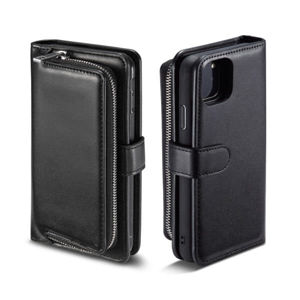 Med dette elegante lommebokdeksel i kunstlær til din iPhone 11, trenger du ikke noen lommebok. Dekselet beskytter ikke bare telefonen mot riper, slag og slaitasje, det har også en kortholder for flere kredittkort, visittkort og sedler samt et rom med glidelås for småpenger og andre ting. Et smart og lekkert beskyttelsedeksel og lommebok i ett som sparer plass i jakkelommen eller håndvesken. Alle porter og knapper på telefonen tilgjengelige uten at du må ta av dekselet.