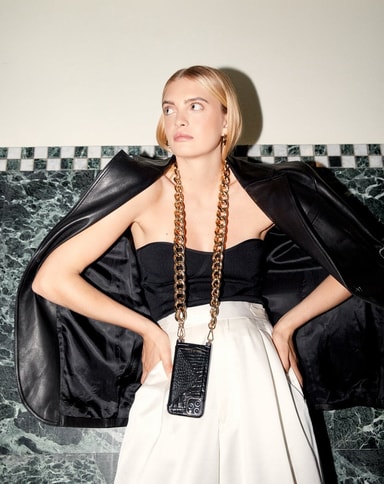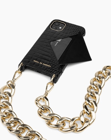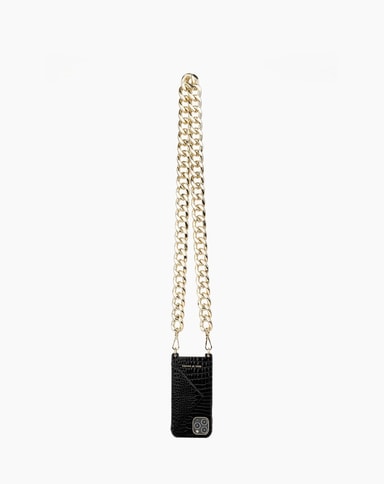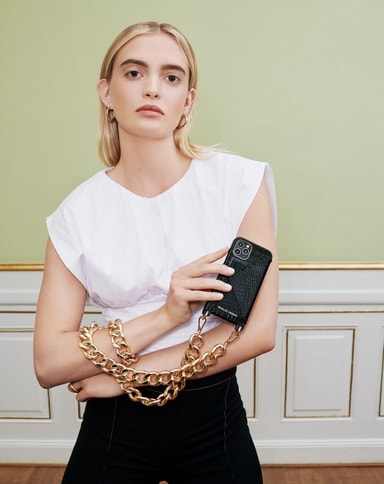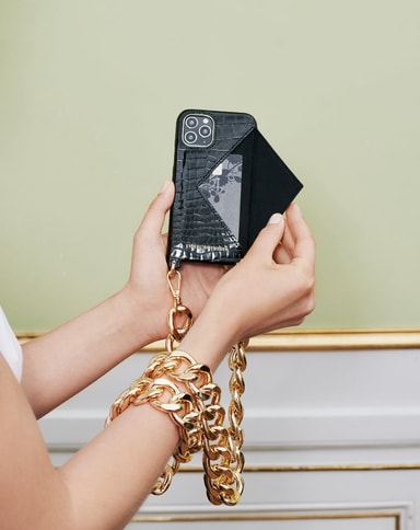 * Gullfargede detaljer rundt kameraet * Dette produktet er laget av etiske og ikke-animalske materialer * Inkluderer e gullkjede som er 10,9 cm langt. * Stroppen kan festes på våre Airpods-vesker. * The Statement Phone Case er kompatibel med skulderstroppene våre. * En kortplass på forsiden med en skjult klaff som har plass til opptil to kort og er laget av slitesterkt kvalitetsmateriale som former seg perfekt til kortene dine * Kan bæres over skulderen, på tvers eller som halskjede. * En del av vår Premium Statement-kolleksjon.