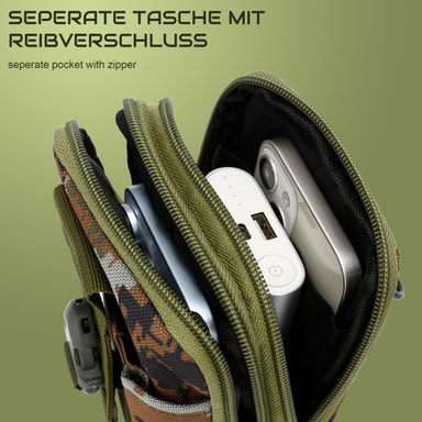 Etuiet er laget av sprutsikker og slitesterk polyester av høy kvalitet, og er robust og beskytter enhetene dine mot riper og skader. Det kamuflasjemønstrede designet gir vesken en stilig, militær design som passer til friluftsutstyret ditt.