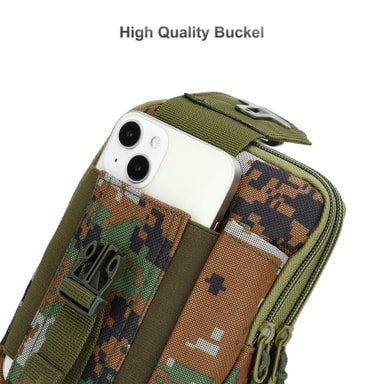Molle-stroppen på baksiden gir fleksible festealternativer til belte, ryggsekk eller vest. Den medfølgende skulderstroppen gir et ekstra bærealternativ. Denne allsidigheten gjør vesken til en uunnværlig følgesvenn.