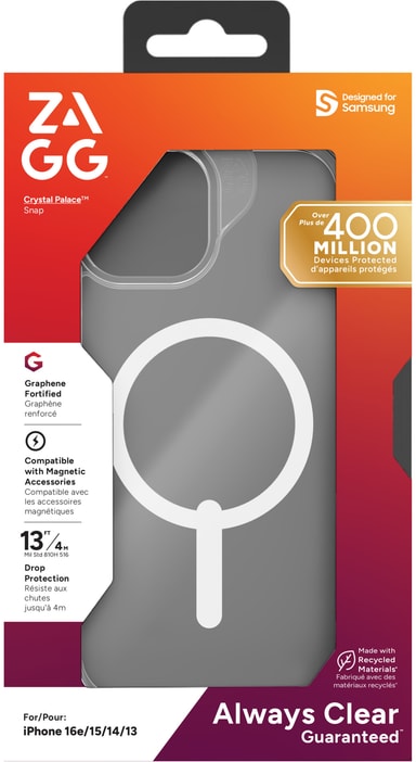 Zagg Crystal Palace Apple iPhone 16E/17E/15/14/13 deksel gir stilfull beskyttelse med ripebestandig overflate, 4m fallbeskyttelse og teknologi mot gulning, som gir et elegant utseende og maksimal holdbarhet.