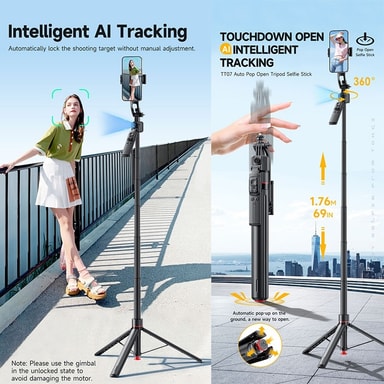 AI Intelligent Tracking: Opplev håndfri filming med avansert AI-ansiktssporingsteknologi. Dette selfie-stativet gjenkjenner og følger automatisk ansiktet ditt, og sikrer at du holder deg i bildet under videosamtaler, direktesendinger eller når du lager engasjerende innhold. Perfekt for vloggere, online instruktører og alle som ønsker å fange dynamiske opptak uten manuelle justeringer. Kompatibelt med smarttelefoner, inkludert iPhone og Samsung-enheter, og tilbyr sømløs integrasjon for alle dine behov for innholdsskaping. AI-sporingen sikrer jevne og presise bevegelser, og gir et profesjonelt preg på videoene dine.