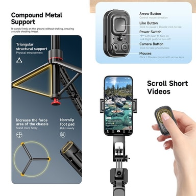 Extended Reach & Stability: Oppnå den perfekte vinkelen med den uttrekkbare 1.73-meters aluminiumslegeringsstangen. Dette selfie-stativet gir et bredt spekter av skytehøyder, ideelt for gruppebilder, naturskjønne bilder og overhead-perspektiver. Den robuste aluminiumslegeringskonstruksjonen sikrer stabilitet på forskjellige overflater, mens anti-shake-håndtaket minimerer uønskede bevegelser, noe som resulterer i klare og stabile opptak. Kompatibelt med actionkameraer og smarttelefoner, inkludert GoPro og Huawei-enheter, er dette stativet din pålitelige følgesvenn for å fange fantastiske bilder i alle miljøer.