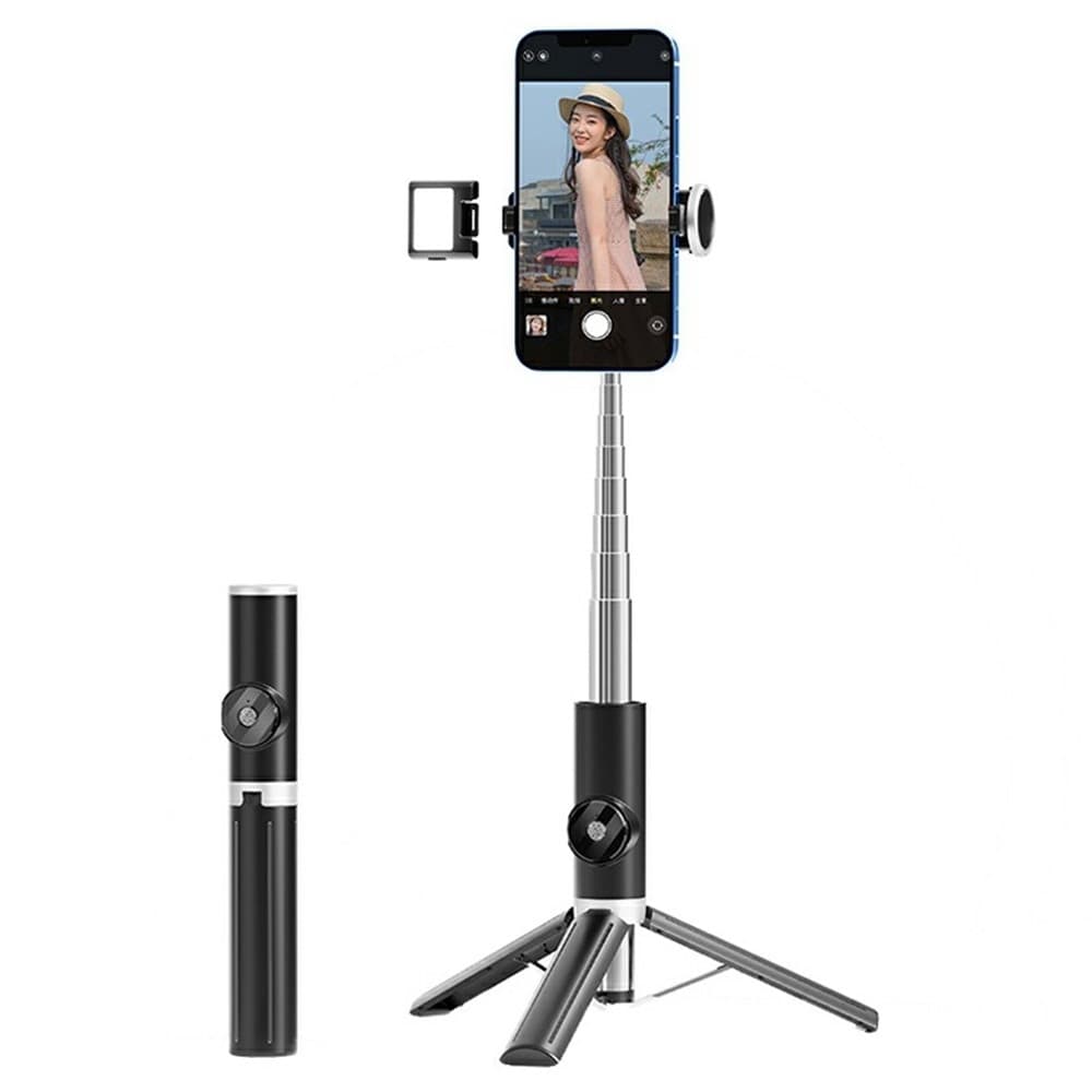 P12S Bærbar Bluetooth-kompatibel fjernkontroll Selfiestang Smarttelefoner Uttrekkbart stativ med 1 lys【Stabilt stativ】Det sterke stativet gir forbedret stabilitet, selv i vindfulle forhold.【360° rotasjon】Støtter 360-graders telefonrotasjon for både hLes mer om produktet