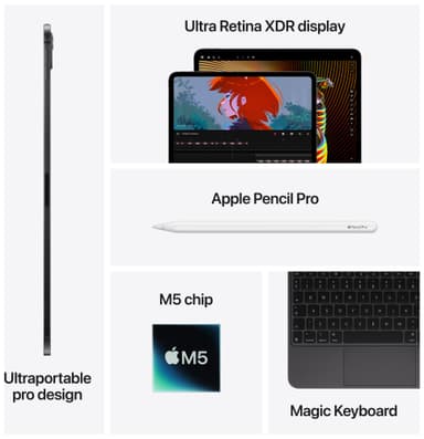 Med iPad Pro 13" kan du lekende lett uttrykke ditt kreative talent, takket være en kraftig Apple M5-chip, Ultra Retina XDR OLED-skjerm med ProMotion og et 12 MP bakre kamera med ProRes-støtte.Les mer om produktet