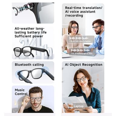 AI-assistent: Opplev fremtiden med våre intelligente AI-briller. Med innebygd AI-assistent kan du enkelt utføre oppgaver ved hjelp av stemmekommandoer. Få sanntidsoversettelser, objektgjenkjenning og svar på spørsmål uten å ta opp telefonen. Perfekt for reiser, læring og daglig bruk. Disse brillene er kompatible med Android 6.0 og nyere, samt iOS 10.0 og nyere, og gir en sømløs opplevelse uansett hvilken enhet du bruker. Nyt friheten av handsfree-betjening og øk produktiviteten din med disse innovative brillene.