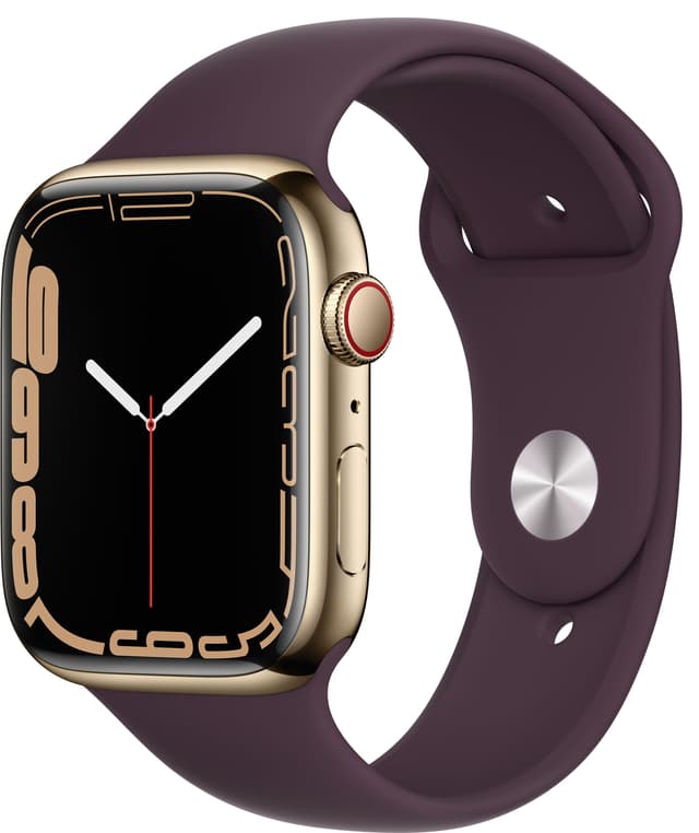 • Apple Watch Series 7 45mm GPS+eSIM (gullstål/mørk kirsebær sportsreim)