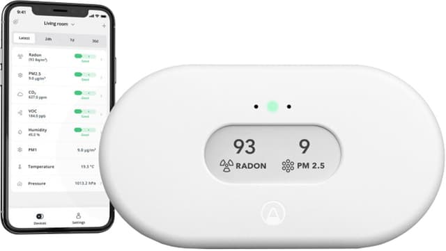 View Plus er utstyrt med 7 luftkvalitetssensorer som måler CO2, VOC, partikler (PM2.5), radon, luftfuktighet, lufttrykkog temperatur.