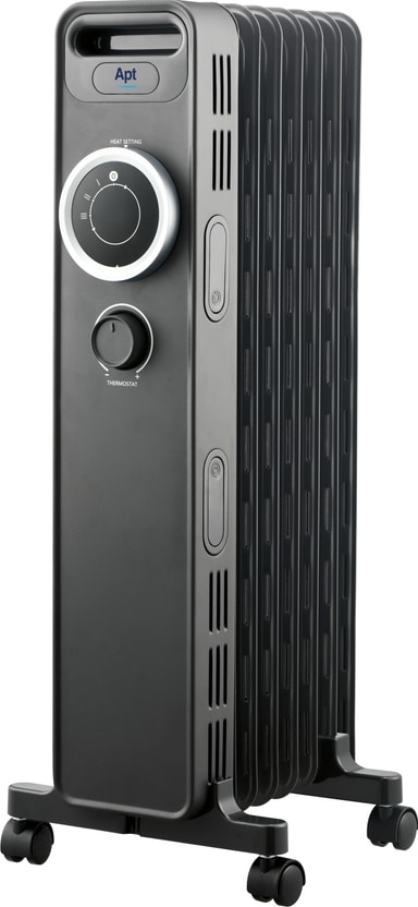 Apt Therma oljeradiator har en elegant, kompakt konstruksjon med 7 ribber for effektiv varmefordeling. Det minimalistiske designet passer inn i ethvert rom uten å ta mye plass.