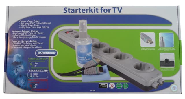Bandridge startpakke for HDTV inkluderer et overspenningsvern med 6 stikkontakter, 2 meter HDMI-kabel og 100 ml skjermrens.Les mer om produktet