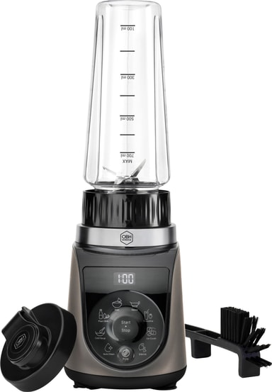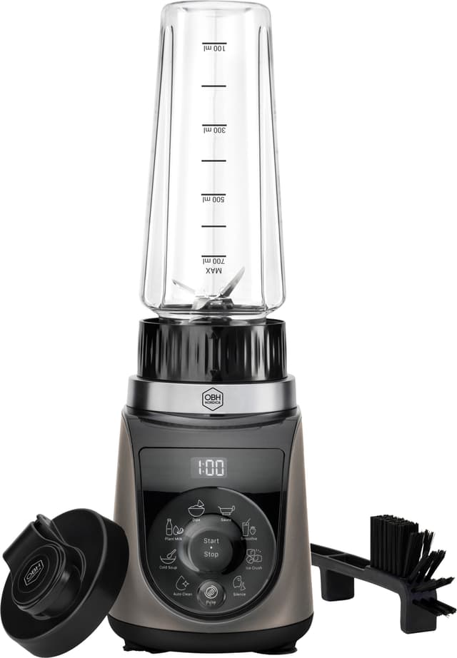 OBH Nordica Blend-Up blender LH190EN0 er en kompakt 1000W blender med 8 forhåndsinnstilte programmer for smoothies, supper, dipper og mer. Den blender direkte i en 700 ml flaske med drikketut, som gjør den perfekt å ta med på farten. Et smart låsesystem sørger for sikkerhet, og en auto-rengjøringsfunksjon forenkler rengjøringen.